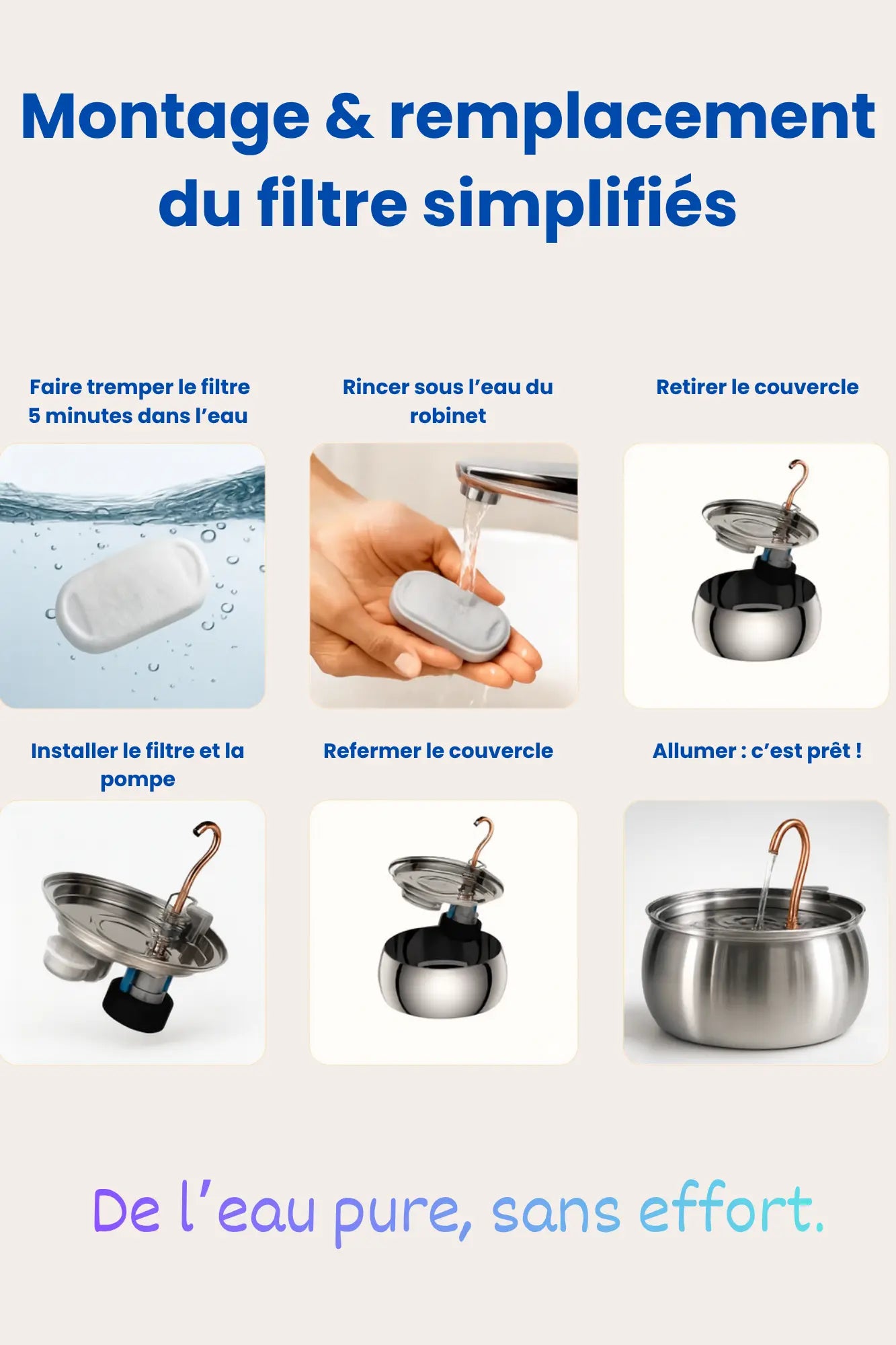 Une eau toujours fraîche, pure et irrésistible, pensée pour le bien-être quotidien de votre compagnon. Silence, hygiène et confort réunis.