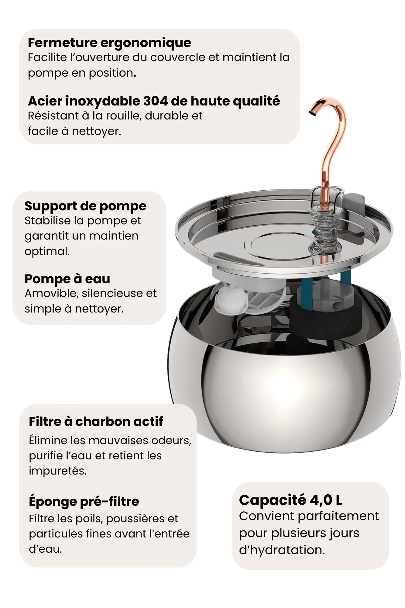 Fabriquée en acier inoxydable de qualité, elle résiste aux rayures, à la corrosion et se nettoie en quelques gestes. Son système de filtration au charbon actif élimine les impuretés, les poils, les odeurs et améliore nettement le goût de l’eau, pour le plus grand plaisir des animaux exigeants.