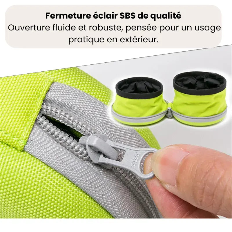 Hydratation et repas toujours à portée de main. Une double gamelle pliable, étanche et légère pour toutes vos aventures avec votre compagnon.