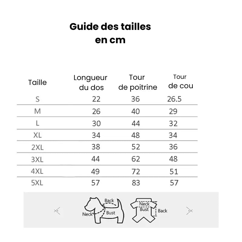 - Tailles : S à 5XL (pour petits, moyens et grands chiens)