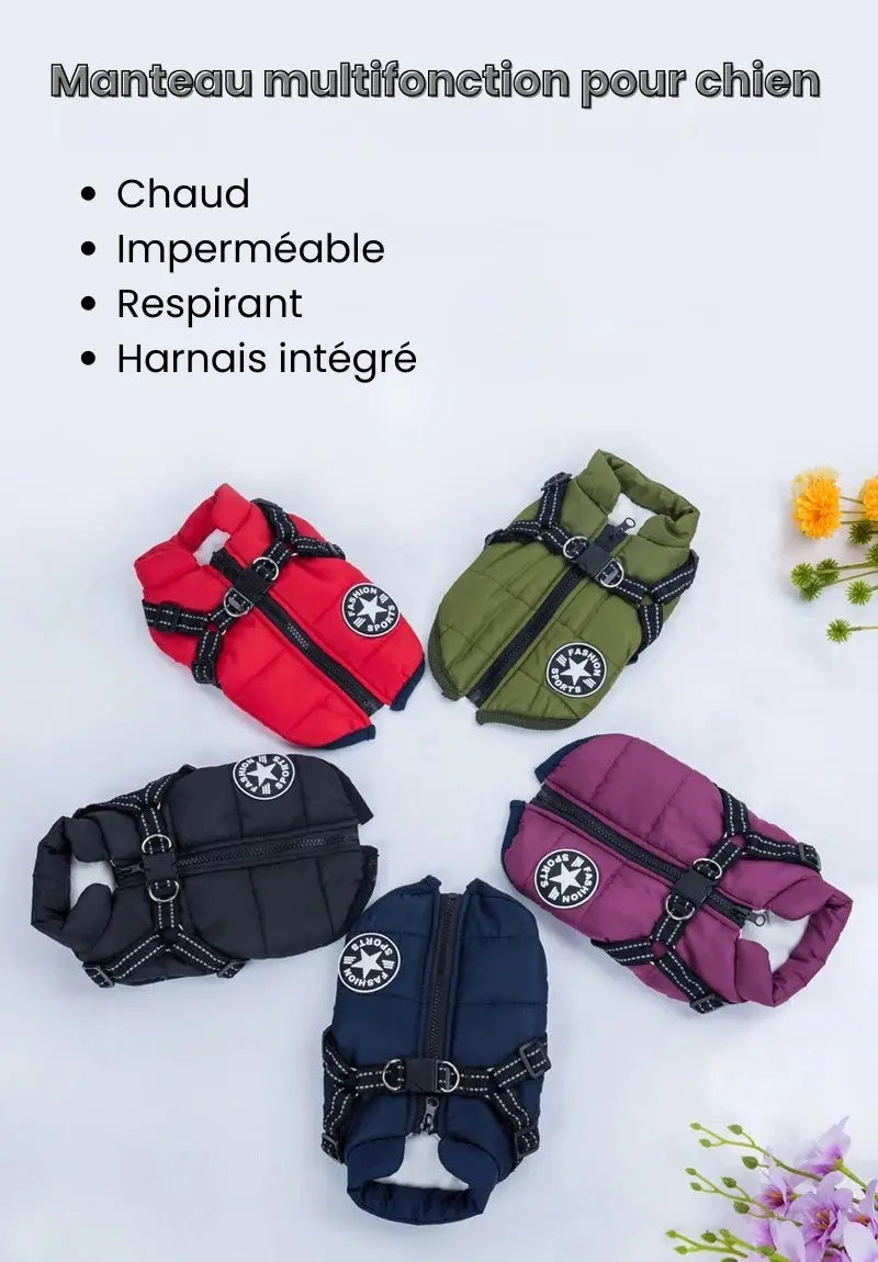 - Fonctions : manteau d’hiver + harnais intégré, attache laisse dorsale