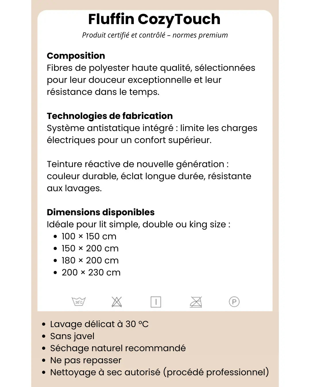 Le 100×150 cm convient pour un animal ou un plaid de canapé, le 200×230 cm est idéal pour partager à deux (ou plus !).